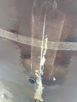 Nun geht es an die Reparatur: Wir harzen drei Glasmatten unter den Rumpf und verpassen Tiny so ein Pflaster mit (halber) Bauchbinde, in der Hoffnung, dass diese Konstruktion die Spannungen, die vom Mast in den Rumpf geleitet werden, aufgefangen werden. Wir werden sehen....